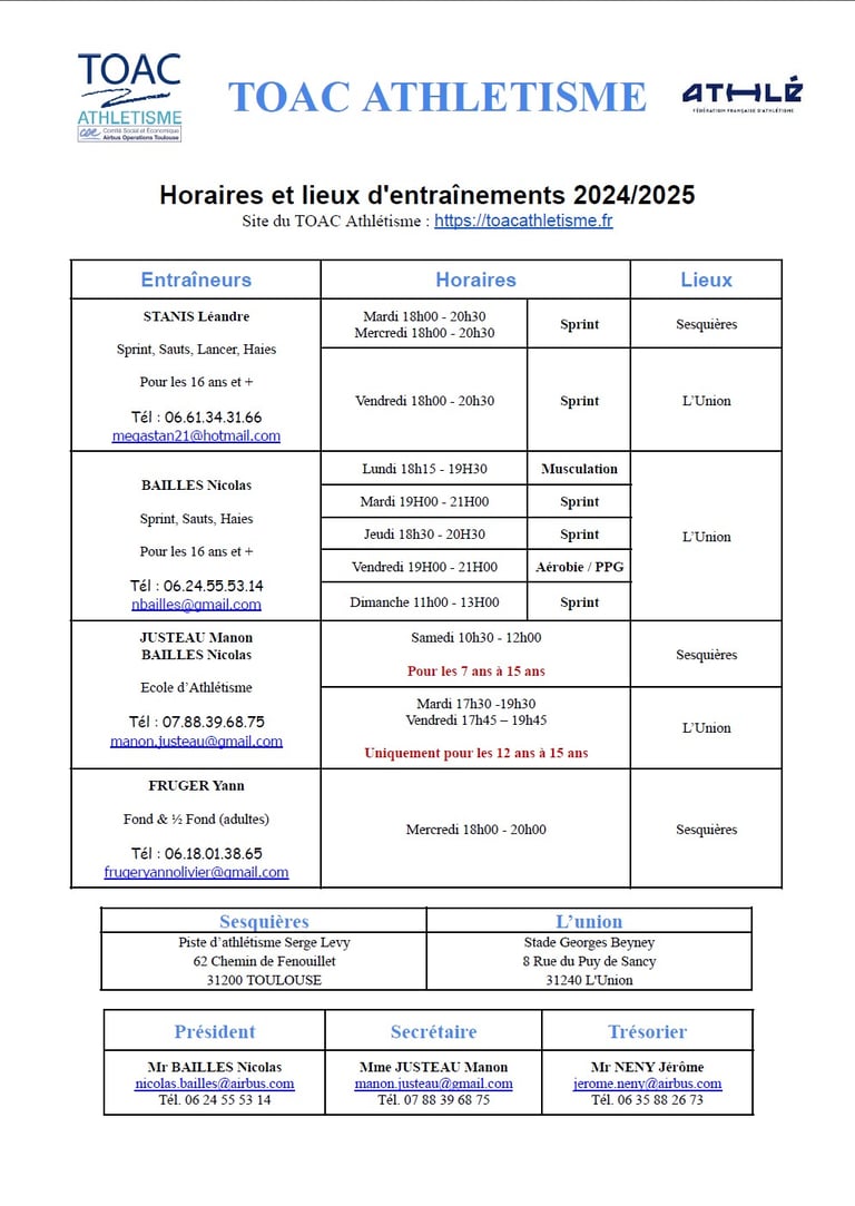Découvrez les horaires et lieux d'entraînement pour les clubs de l'US Fronton, Toac athlétisme et de l'Union.